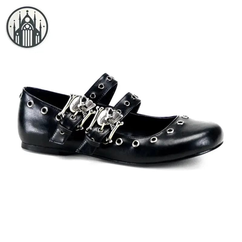Faites une pause des talons et enfilez ces ballerines gothiques Tête de Mort extensible double avec boucle de crâne ornée d’œillets.