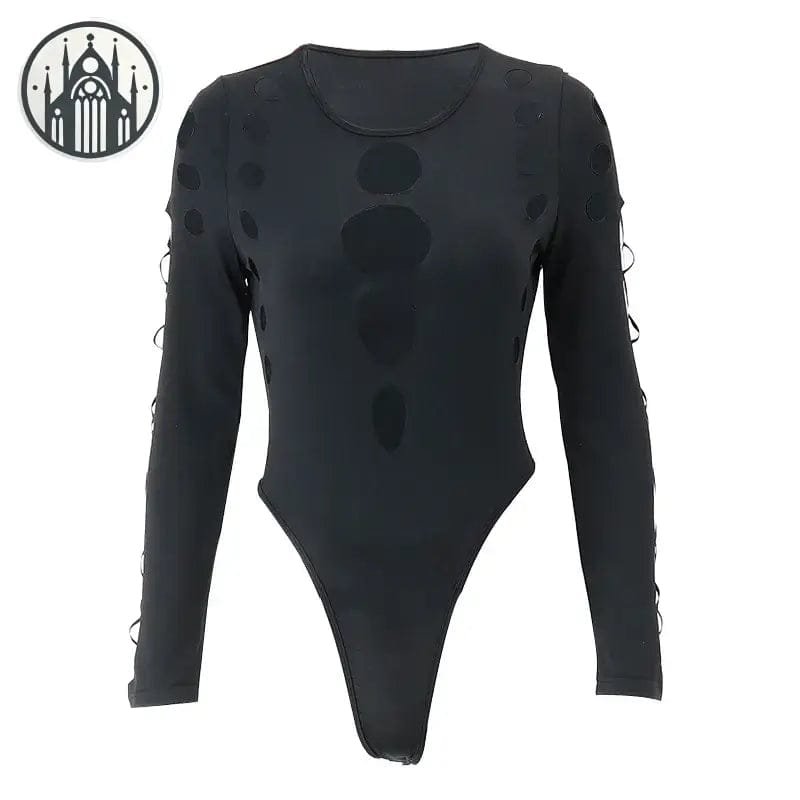 Ce body gothique à trous est un must-have pour toute fan de la mode alternative. Il est confectionné dans un tissu noir opaque et est orné de nombreux trous qui lui confèrent un look rock et sexy. Le body est très échancré au niveau de la taille et des jambes, ce qui le rend idéal pour montrer votre corps.