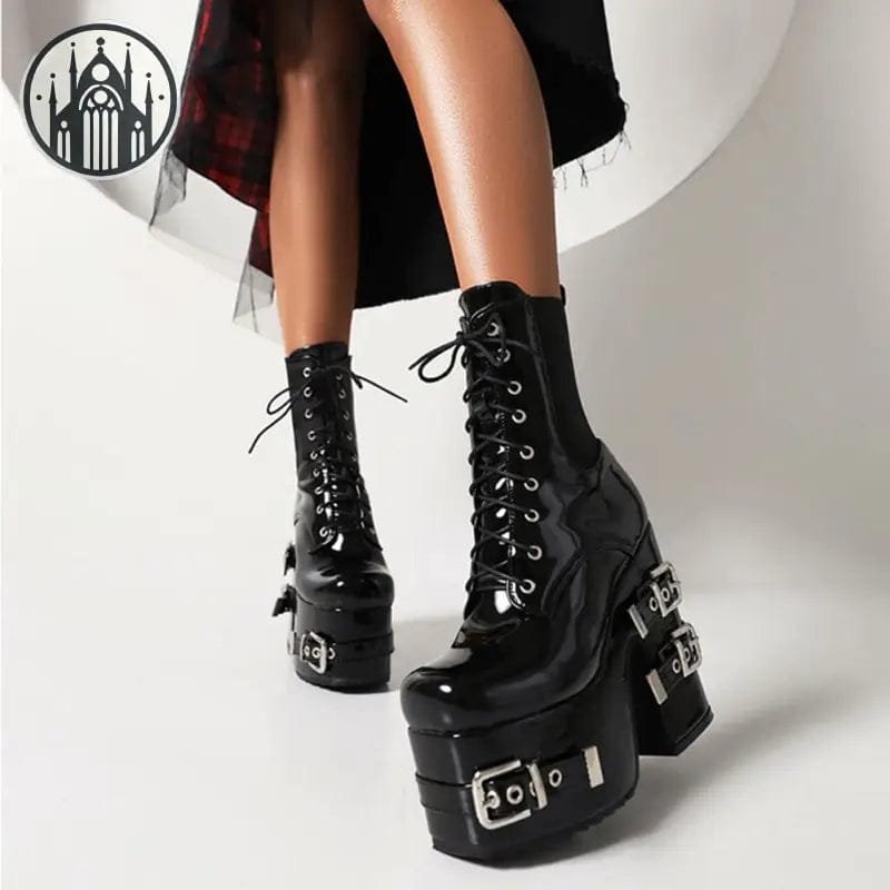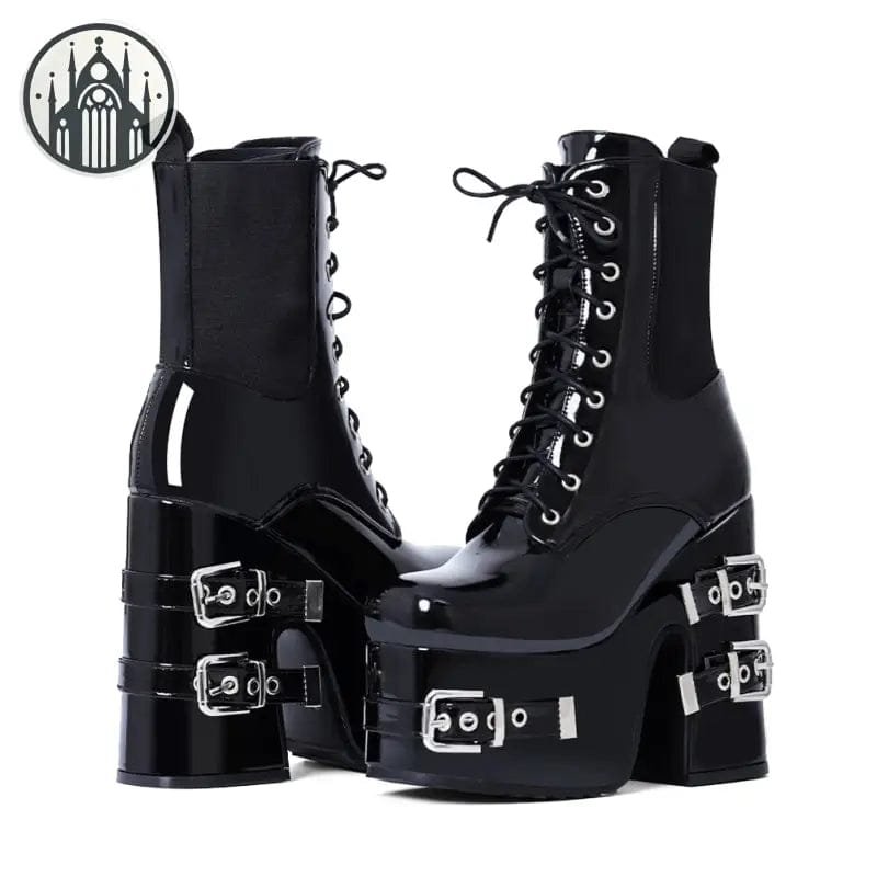 Les bottes sont dotées de talons imposants, de sangles à boucle, de fermetures à lacets sur le devant et de soufflets élastiques sur les côtés pour un ajustement parfait. Elles sont conçues pour vous faire briller et attirer tous les regards.