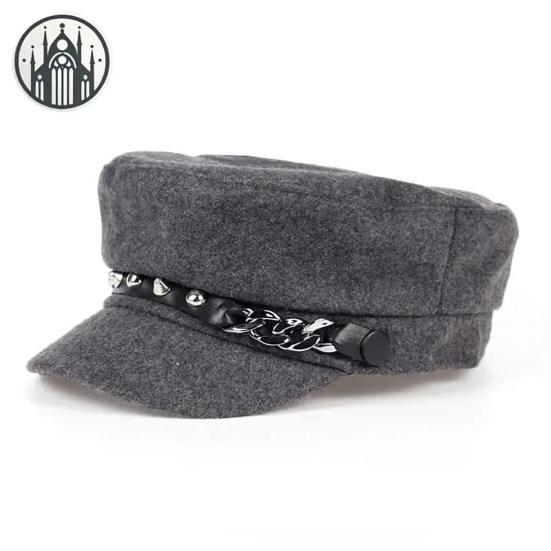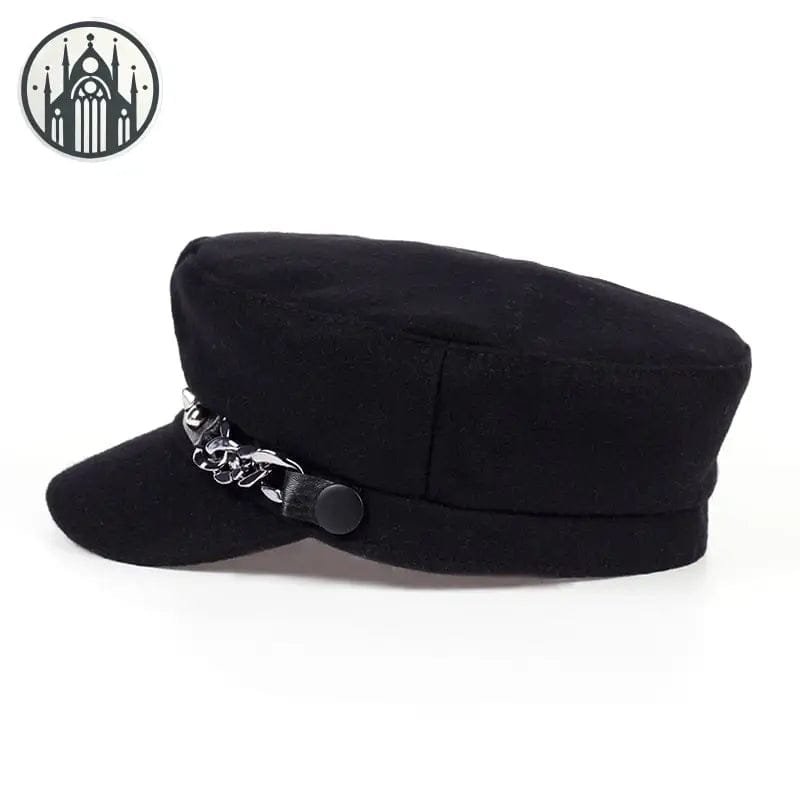 La casquette gothique à rivets et à chaîne est fabriquée en laine de qualité supérieure, rehaussée d’une sangle en cuir végétalien autour du bord pour un look unique. Les clous et la chaîne latérale ajoutent une touche rebelle à votre tenue.