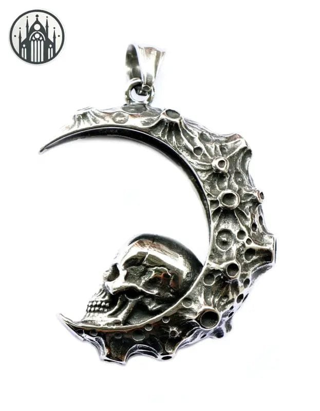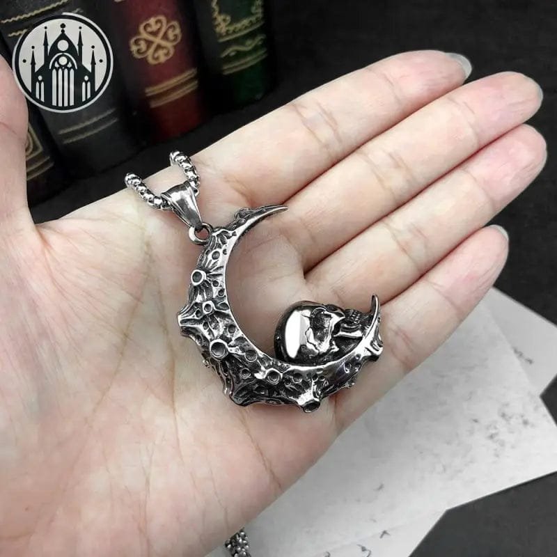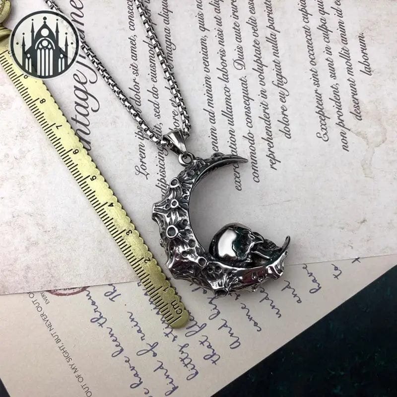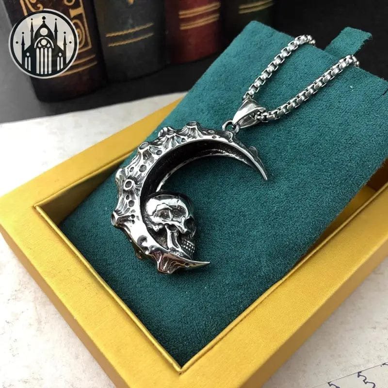 Ce magnifique collier à pendentif présente un croissant de lune très détaillé sur lequel repose un crâne, offrant un style gothique unique et accrocheur. Parfait pour les amateurs de l’esthétique sombre et mystérieuse !