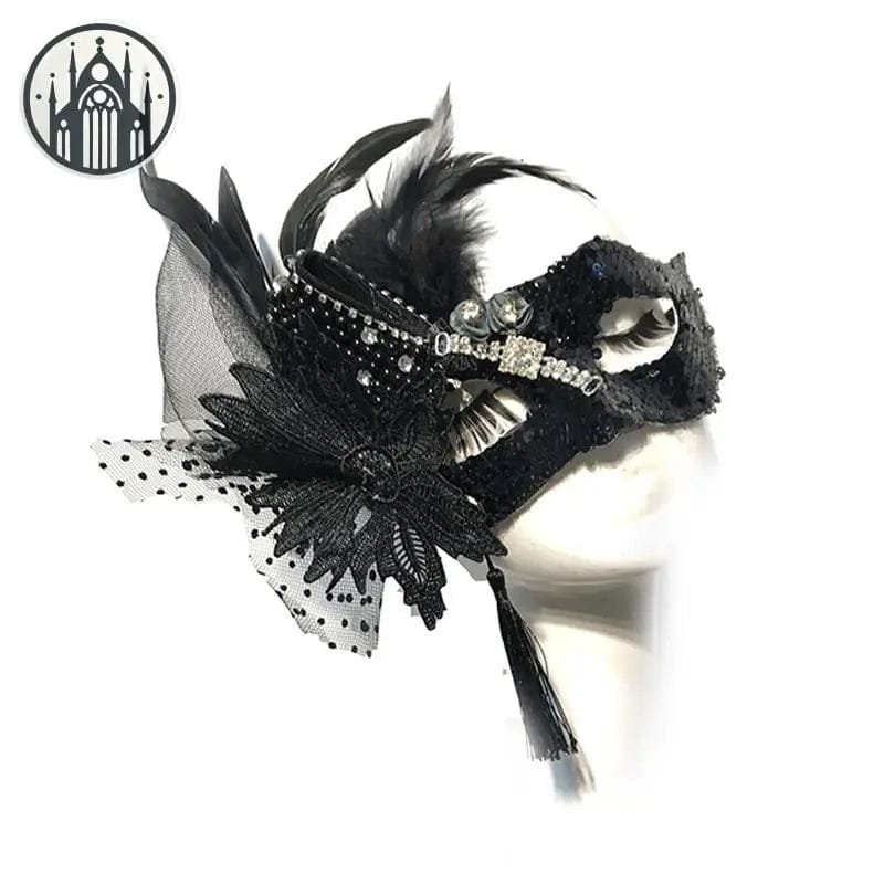 Masque gothique en plume carnavalesque mardi-gras en dentelle noire dentelle d’automne noire faite à la main. La dentelle foncée, délicate et autoportante fait un masque enchanteur.