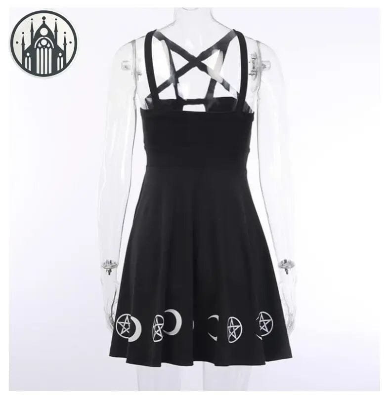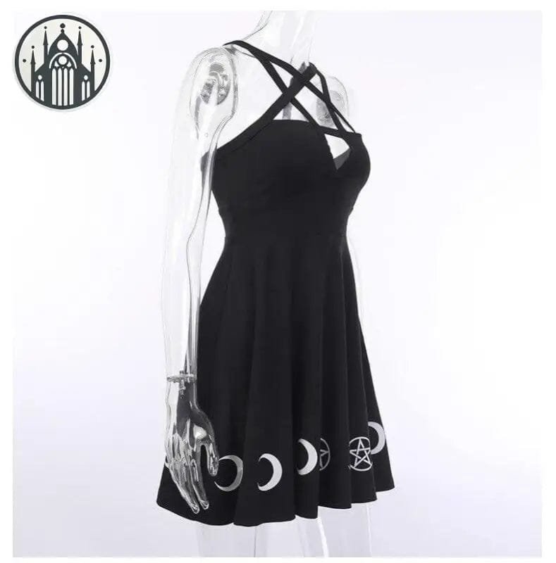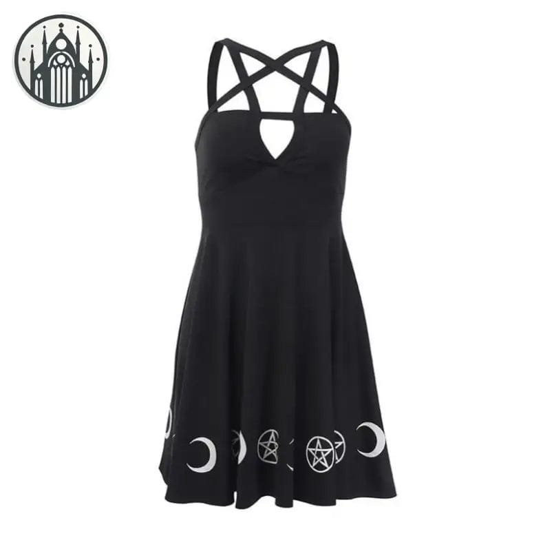 Ce modèle exquis te transporte dans un univers sombre et envoûtant, parfait pour exprimer ta personnalité rebelle et ton style unique. Les symboles occultes et le décolleté en pentagramme ajoutent une touche mystérieuse et séduisante à cette robe gothique vintage. Un incontournable pour les amateurs du genre !